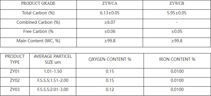 碳化钨粉末(WC):硬度9.5(莫氏硬度),密度15.63 g/cm³,熔点2870℃,粒径0.22-6.00 μm(可选),氧含量≤0.25%,铁含量≤0.03%。它具有极高的耐磨性和耐腐蚀性,是硬质合金的核心原料。